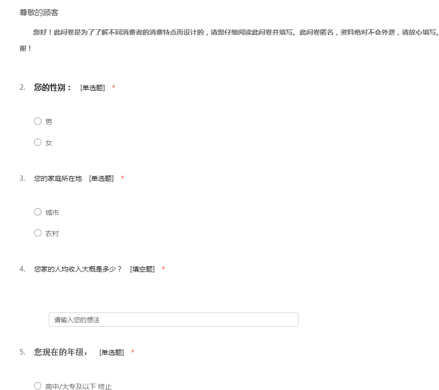 您好!此问卷是为了了解不同消费者的消费特点而设计的,请您仔细阅读此问卷并填写。此问卷匿名,资料绝对不会外泄,请放心填写。我们将对您给与的帮助表示最诚挚的感谢!