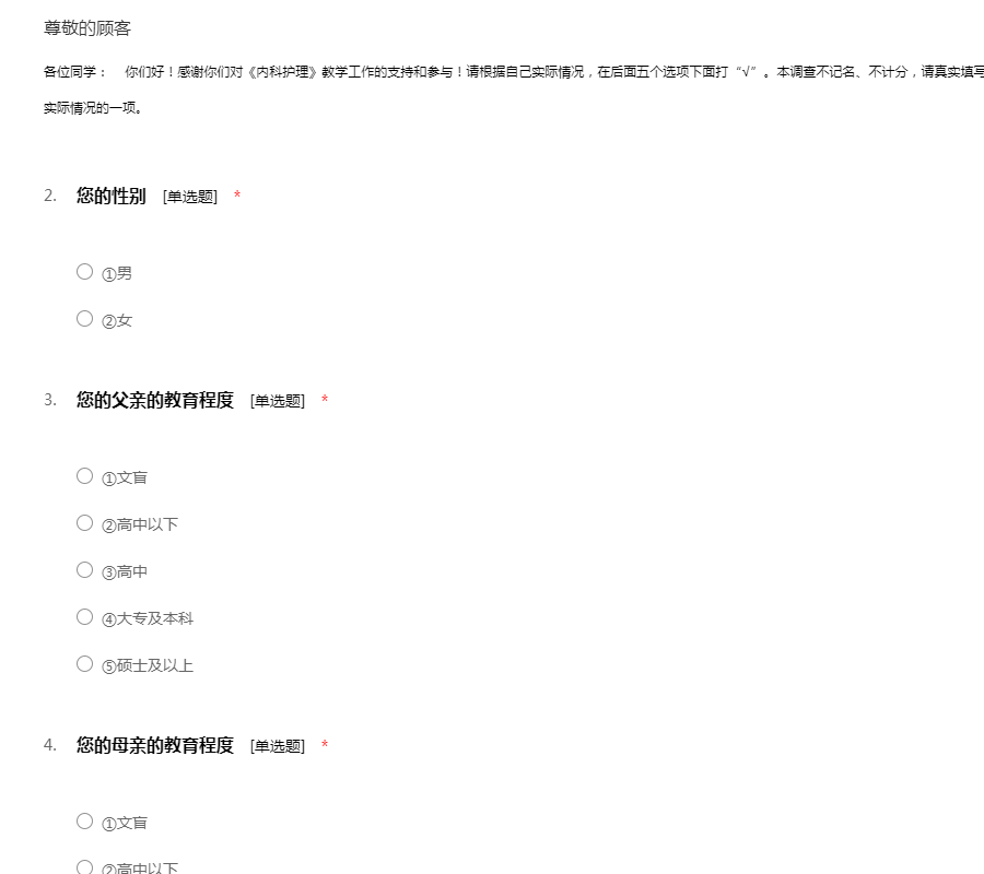 各位同学: 你们好!感谢你们对《内科护理》教学工作的支持和参与!请根据自己实际情况,在后面五个选项下面打“√”。本调查不记名、不计分,请真实填写。谢谢!注意:每一题都是单选,选出最符合您实际情况的一项。