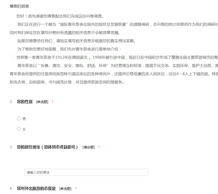 我们正在进行一个题为“国际青年旅舍在国内的现状及发展前景”的课题调研,本问卷的统计结果将作为我们的调研材料之一,除此之外不会另作他用,同时我们保证您在填写问卷时所透露的相关信息不会被恶意泄漏。