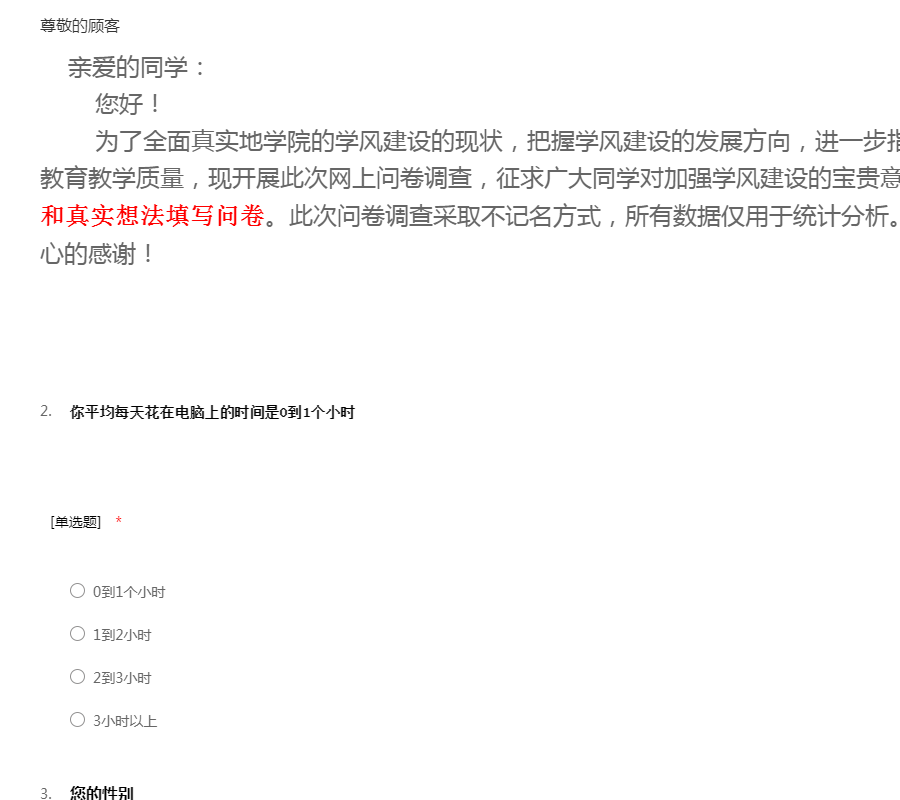 亲爱的同学: 您好! 为了全面真实地学院的学风建设的现状,把握学风建设的发展方向,进一步指导大学学风建设,提高教育教学质量,现开展此次网上问卷调查,征求广大同学对加强学风建设的宝贵意见。请您按照实际情况和真实想法填写问卷。此次问卷调查采取不记名方式,所有数据仅用于统计分析。对您的支持我们表示衷心的感谢!