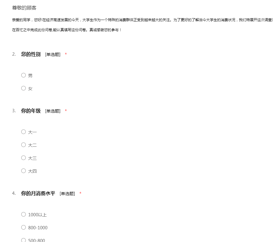 为了进一步了解我们当代大学生对消费观的认识,我们特别制定了这份调查问卷,以此来让当代大学生更清楚的认识自己,敬请您回答以下问题。