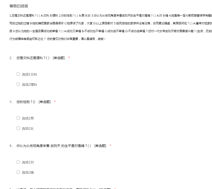 1.您是文科还是理科?( ) A:文科 B:理科 2.你的性别?( ) A:男 B:女 3.你认为从宏观角度来看武则天的生平是对是错?( ) A:对 B:错 4.她是唯一至今都把陵墓保存完整的皇帝,原因何在?( ) A:她的儿子因她自动让位而放过她的过错 B:她的确把国家治理得很好 C:她原谅了仇家,大度 D:以上原因都对 5.她死后她的家族并没有没落,反而更加强盛,其原因何在?( ) A:皇帝对祖家的关照 B:她杀光了仇人 C:她的功大于过 D:其他原因 6.您认为她的一生是否算成功或幸福?( ) A:成功又幸福 B:不成功也不幸福 C:成功但不幸福 D:不成功但幸福 7.您对一代女帝武则天哪方面最感兴趣?(生活,历史影响,政绩等)为什么? 8.您认为现今社会武则天行为或精神有哪些可取之处? 您的意见对我们非常重要,请认真填写,谢谢!