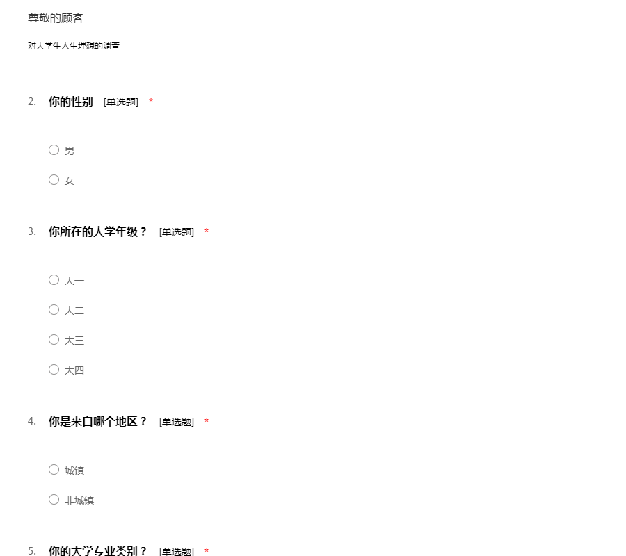 亲爱的同学:你好!为了更好地了解大家的恋爱观及恋爱状况,为大家现在或以后可能遇到的问题提供帮助,我们特设计此问卷。问卷所用数据均用于统计分析且为匿名调查,我们会保护你的隐私权,望如实回答。非常感谢你的支持。