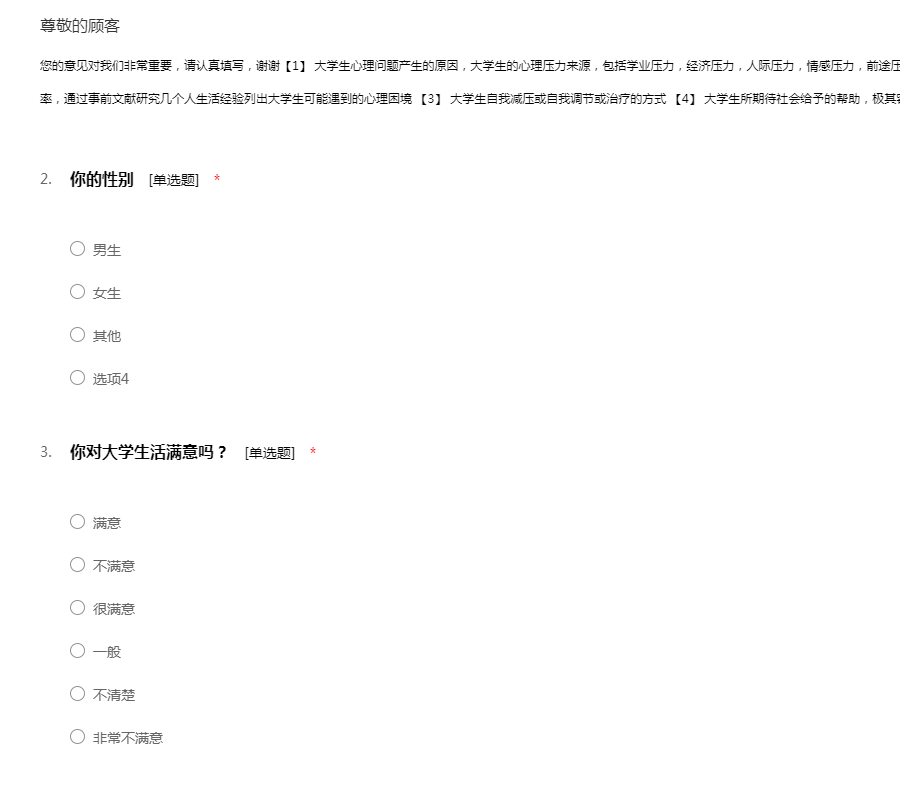 您的意见对我们非常重要,请认真填写,谢谢【1】 大学生心理问题产生的原因,大学生的心理压力来源,包括学业压力,经济压力,人际压力,情感压力,前途压力 【2】 大学生心理问题的具体类型及分布频率,通过事前文献研究几个人生活经验列出大学生可能遇到的心理困境 【3】 大学生自我减压或自我调节或治疗的方式 【4】 大学生所期待社会给予的帮助,极其容易接受的解决办法