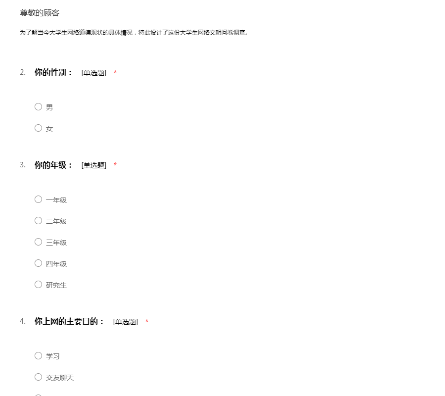 为了解当今大学生网络道德现状的具体情况,特此设计了这份大学生网络文明问卷调查。