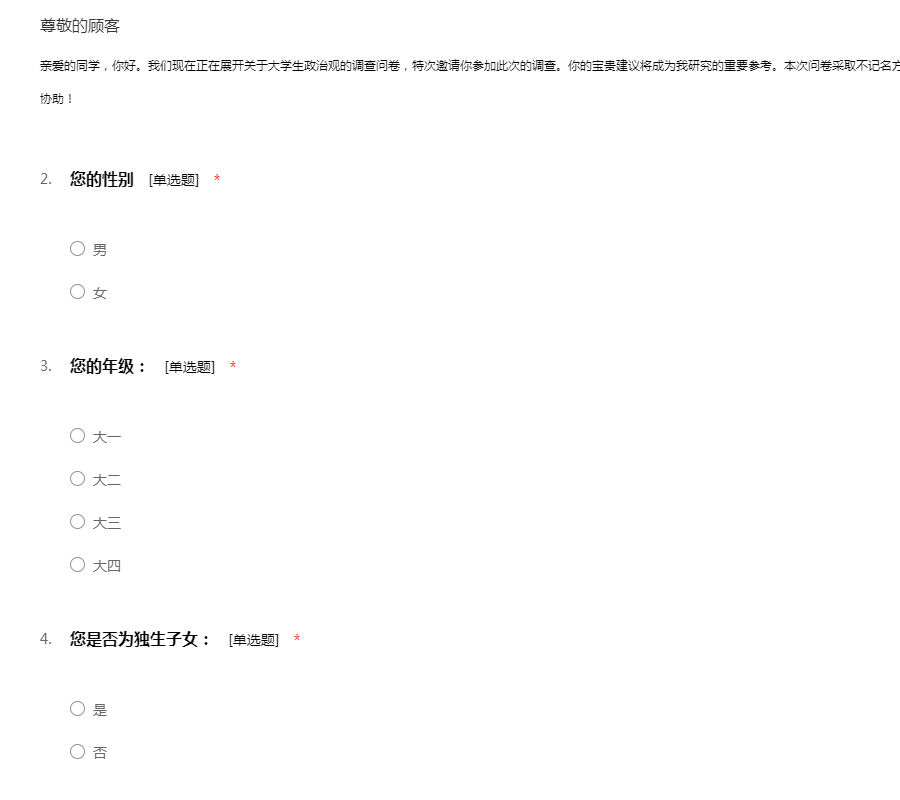 亲爱的同学,你好。我们现在正在展开关于大学生政治观的调查问卷,特次邀请你参加此次的调查。你的宝贵建议将成为我研究的重要参考。本次问卷采取不记名方式,你的回答我们会严格保密。感谢你对我们的协助!