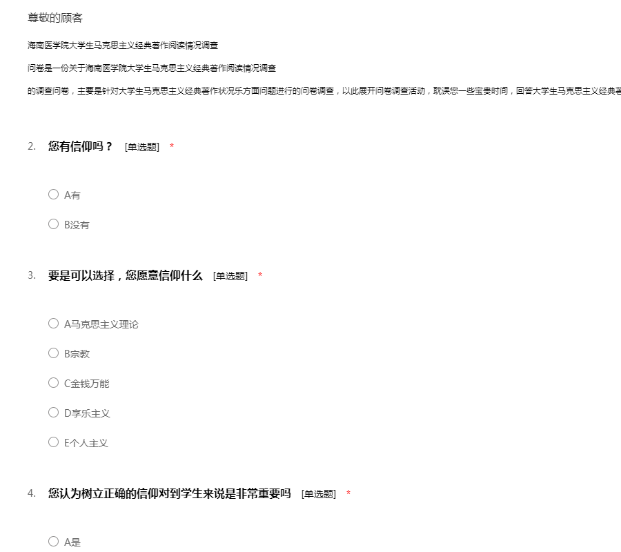 海南医学院大学生马克思主义经典著作阅读情况调查问卷是一份关于海南医学院大学生马克思主义经典著作阅读情况调查的调查问卷,主要是针对大学生马克思主义经典著作状况乐方面问题进行的问卷调查,以此展开问卷调查活动,耽误您一些宝贵时间,回答大学生马克思主义经典著作状况调查问卷,谢谢您的合作。
