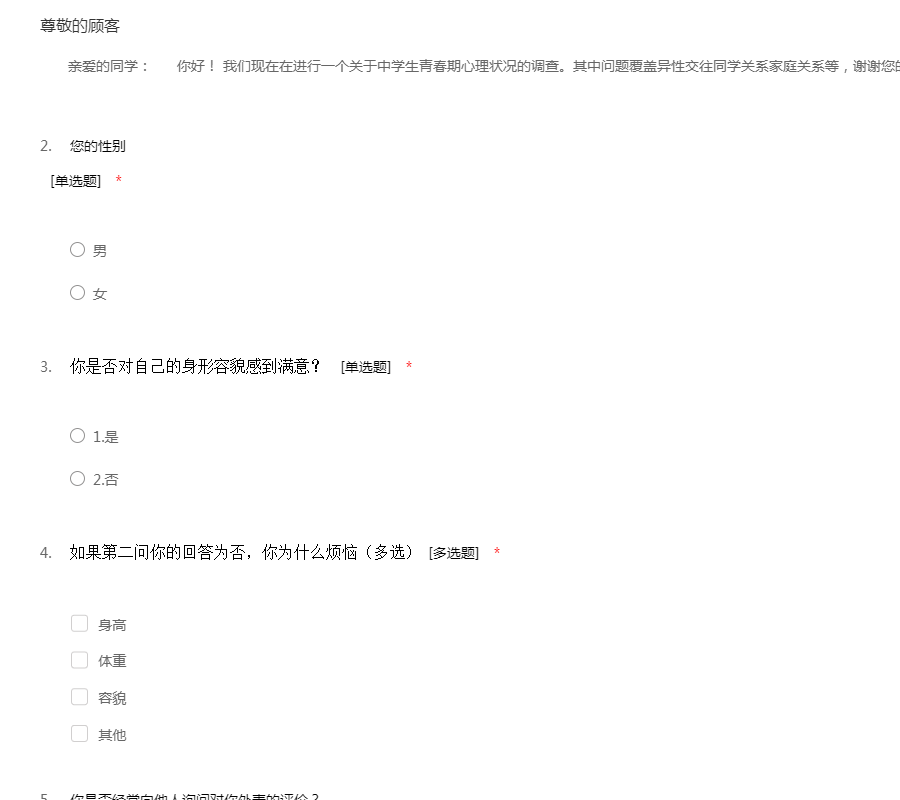 亲爱的同学: 你好! 我们现在在进行一个关于中学生青春期心理状况的调查。其中问题覆盖异性交往同学关系家庭关系等,谢谢您的参与!~\(≧▽≦)/~