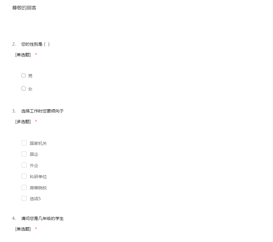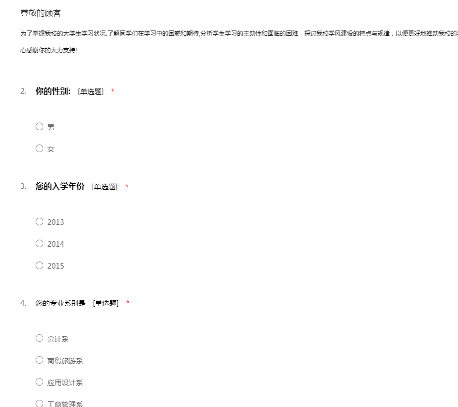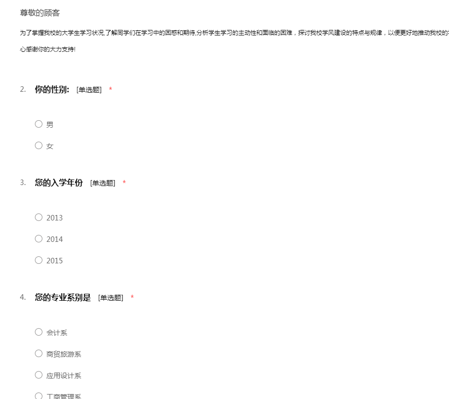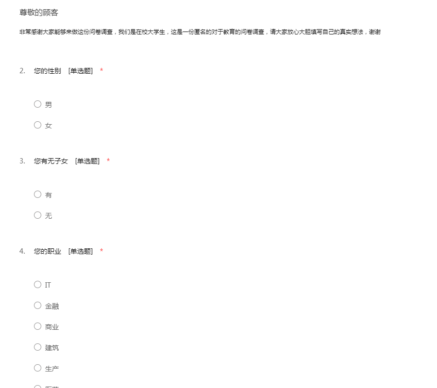 非常感谢大家能够来做这份问卷调查,我们是在校大学生,这是一份匿名的对于教育的问卷调查,请大家放心大胆填写自己的真实想法,谢谢