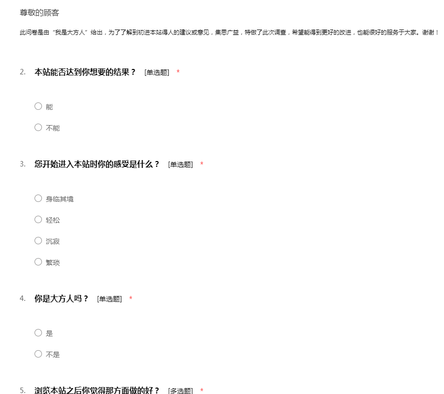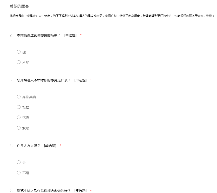 此问卷是由“我是大方人”给出,为了了解到初进本站得人的建议或意见,集思广益,特做了此次调查,希望能得到更好的改进,也能很好的服务于大家。谢谢!