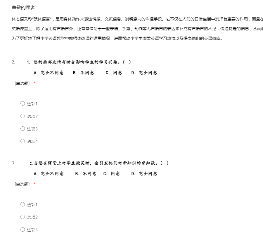 体态语又称"肢体语言",是用身体动作来表达情感、交流信息、说明意向的沟通手段。它不仅在人们的日常生活中发挥着重要的作用,而且在英语教学中也扮演者重要的角色。教师在英语课堂上,除了运用有声语言外,还常常借助于一些表情、手势、动作等无声语言的表达来补充有声语言的不足,传递特定的信息,从而收到良好的教学效果。本问卷的目的在于为了更好地了解小学英语教学中教师体态语的运用情况,进而帮助小学生激发英语学习热情以及提高他们的英语效率。