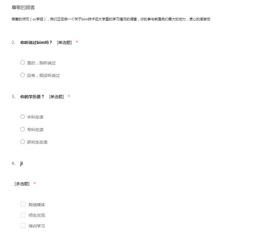 亲爱的师兄(or学姐),我们正在做一个关于bim技术在大学里的学习情况的调查,你的参与就是我们最大的动力,衷心的感谢您