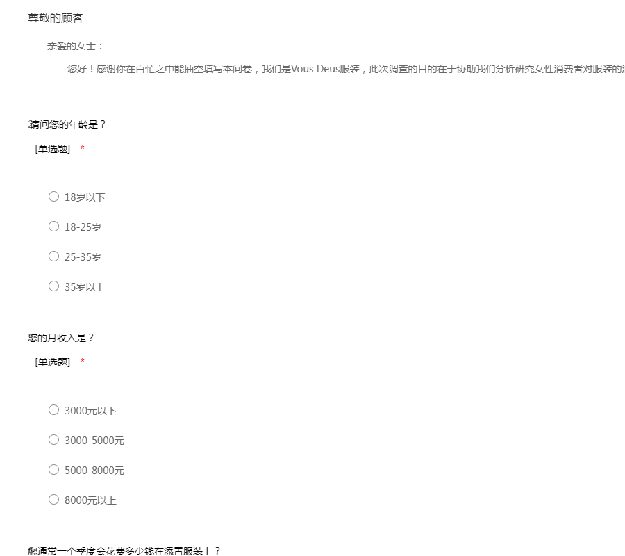 亲爱的女士: 您好!感谢你在百忙之中能抽空填写本问卷,我们是Vous Deus服装,此次调查的目的在于协助我们分析研究女性消费者对服装的消费情况。本问卷采取匿名填写。