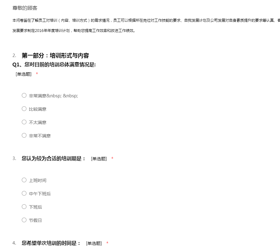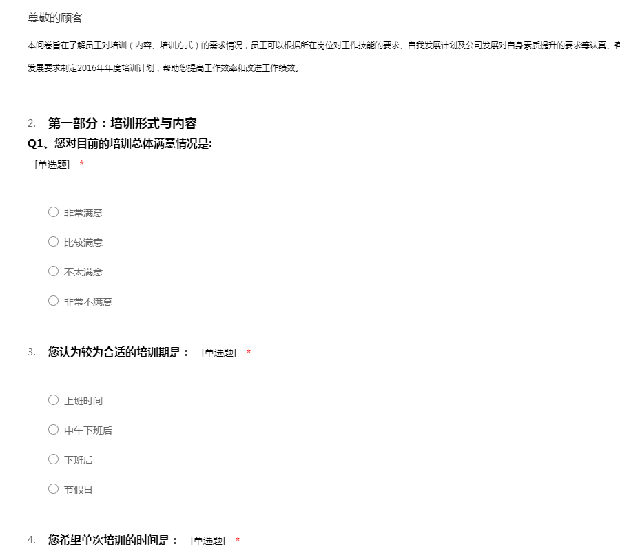 本问卷旨在了解员工对培训(内容、培训方式)的需求情况,员工可以根据所在岗位对工作技能的要求、自我发展计划及公司发展对自身素质提升的要求等认真、客观的填写本问卷。我们会根据您的需求和公司的发展要求制定2016年年度培训计划,帮助您提高工作效率和改进工作绩效。
