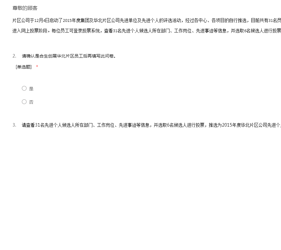 片区公司于12月4日启动了2015年度集团及华北片区公司先进单位及先进个人的评选活动,经过各中心、各项目的自行推选,目前共有31名员工入围2015年度先进个人候选人名单,现进入网上投票阶段。每位员工可登录投票系统,查看31名先进个人候选人所在部门、工作岗位、先进事迹等信息,并选取6名候选人进行投票.