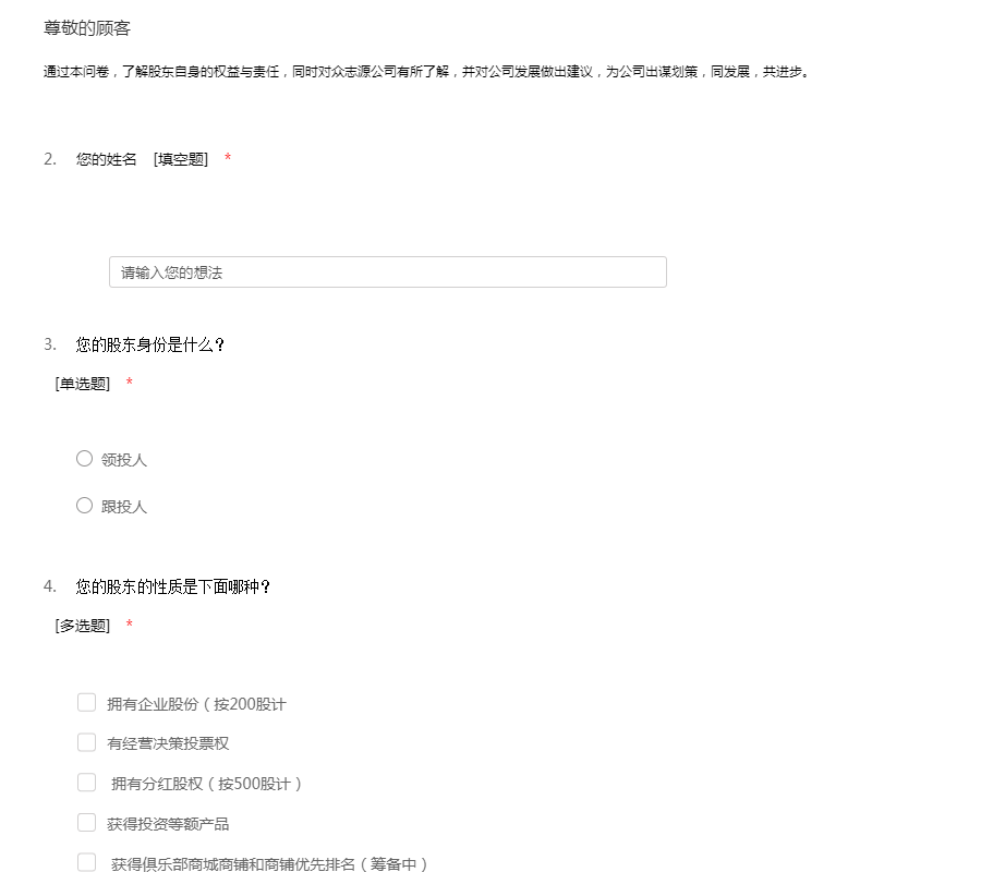 通过本问卷,了解股东自身的权益与责任,同时对众志源公司有所了解,并对公司发展做出建议,为公司出谋划策,同发展,共进步。