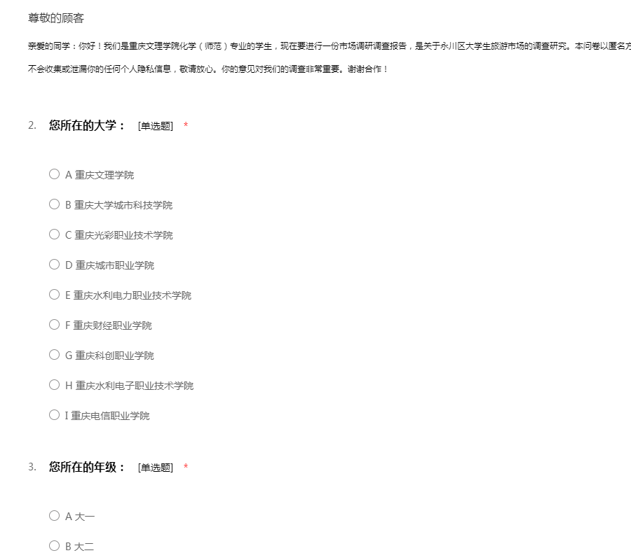 亲爱的同学:你好!我们是重庆文理学院化学(师范)专业的学生,现在要进行一份市场调研调查报告,是关于永川区大学生旅游市场的调查研究。本问卷以匿名方式记录,调查所收集到的数据只用于学术研究,不会收集或泄漏你的任何个人隐私信息,敬请放心。你的意见对我们的调查非常重要。谢谢合作!