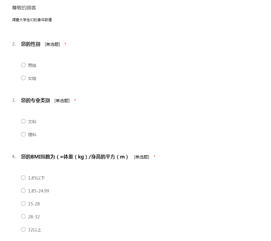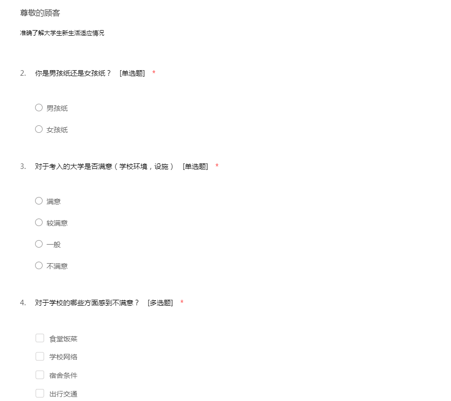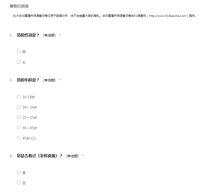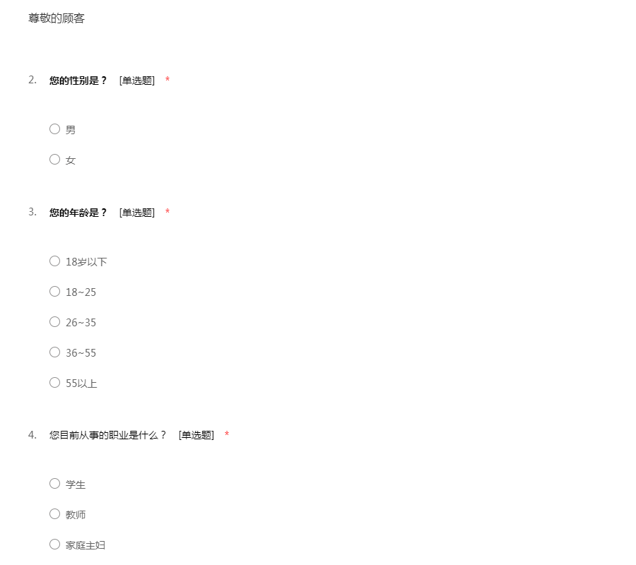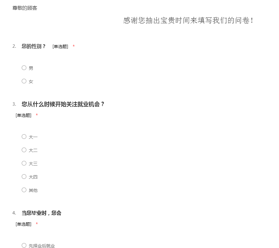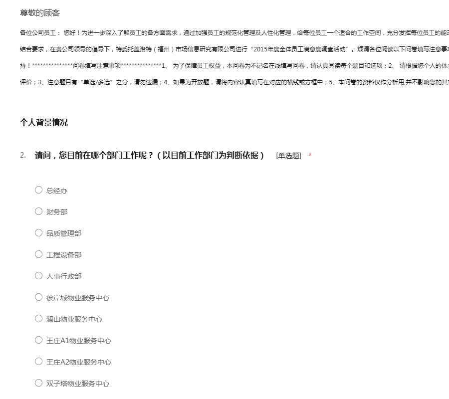 各位公司员工: 您好!为进一步深入了解员工的各方面需求,通过加强员工的规范化管理及人性化管理,给每位员工一个适合的工作空间,充分发挥每位员工的能动性,实现个人发展目标与企业发展目标的紧密结合要求,在贵公司领导的倡导下,特委托盖洛特(福州)市场信息研究有限公司进行“2015年度全体员工满意度调查活动”。烦请各位阅读以下问卷填写注意事项后,根据自身体验,认真填写问卷,谢谢支持!***************问卷填写注意事项***************1、 为了保障员工权益,本问卷为不记名在线填写问卷,请认真阅读每个题目和选项;2、 请根据您个人的体会、感受、认识,对正式问卷中的各项问题做出评价;3、注意题目有“单选/多选”之分,请勿遗漏;4、如果为开放题,请将内容认真填写在对应的横线或方框中;5、本问卷的资料仅作分析用,并不影响您的其它方面;