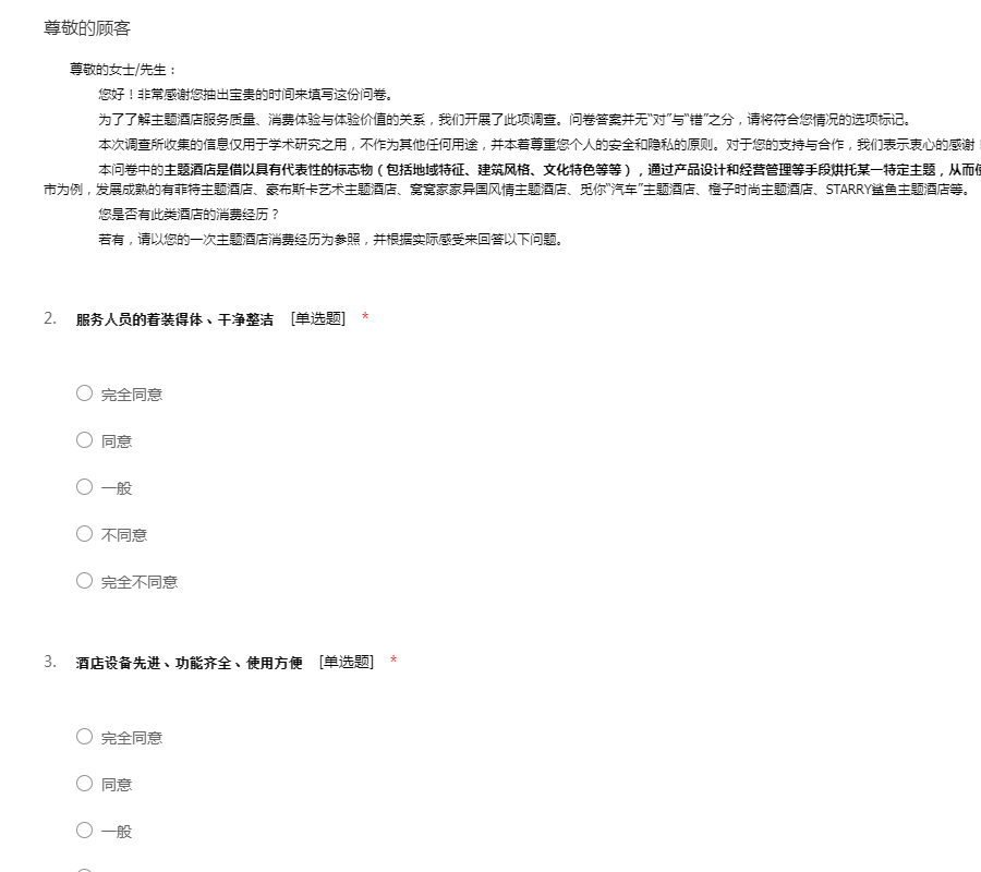 尊敬的女士/先生: 您好!非常感谢您抽出宝贵的时间来填写这份问卷。 为了了解主题酒店服务质量、消费体验与体验价值的关系,我们开展了此项调查。问卷答案并无“对”与“错”之分,请将符合您情况的选项标记。 本次调查所收集的信息仅用于学术研究之用,不作为其他任何用途,并本着尊重您个人的安全和隐私的原则。对于您的支持与合作,我们表示衷心的感谢! 本问卷中的主题酒店是借以具有代表性的标志物(包括地域特征、建筑风格、文化特色等等),通过产品设计和经营管理等手段烘托某一特定主题,从而使顾客获得个性化体验的一种新型酒店。以长沙市为例,发展成熟的有菲特主题酒店、豪布斯卡艺术主题酒店、窝窝家家异国风情主题酒店、觅你“汽车”主题酒店、橙子时尚主题酒店、STARRY鲨鱼主题酒店等。 您是否有此类酒店的消费经历? 若有,请以您的一次主题酒店消费经历为参照,并根据实际感受来回答以下问题。