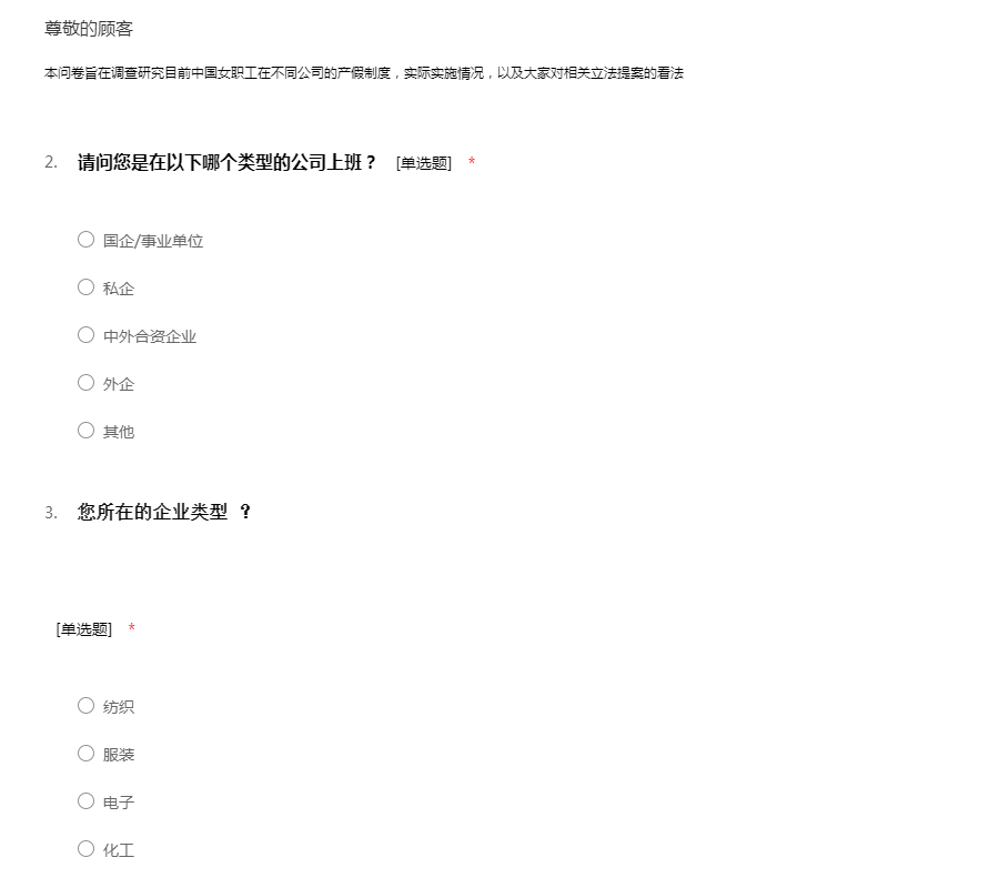 本问卷旨在调查研究目前中国女职工在不同公司的产假制度,实际实施情况,以及大家对相关立法提案的看法