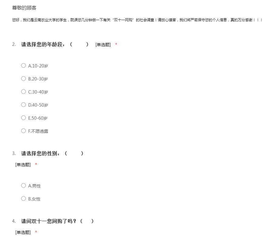您好,我们是云南农业大学的学生,耽误您几分钟做一下有关“双十一网购”的社会调查!请放心填答,我们将严密保守您的个人信息,真的万分感谢!!!