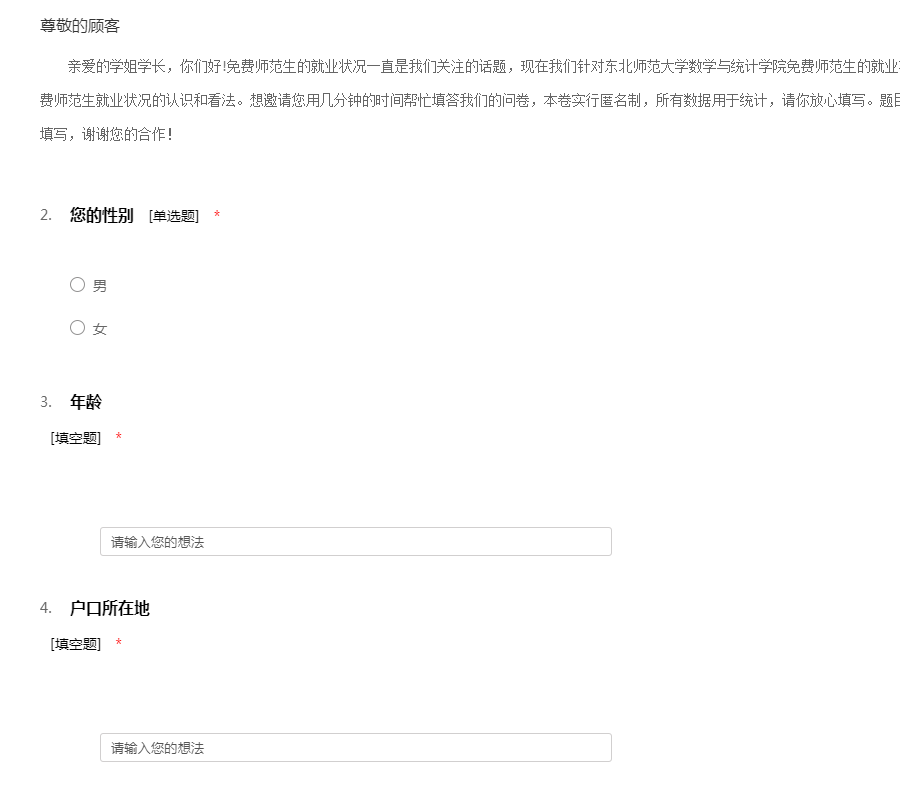 亲爱的学姐学长,你们好!免费师范生的就业状况一直是我们关注的话题,现在我们针对东北师范大学数学与统计学院免费师范生的就业状况做一个调查问卷,旨在了解大家对免费师范生就业状况的认识和看法。想邀请您用几分钟的时间帮忙填答我们的问卷,本卷实行匿名制,所有数据用于统计,请你放心填写。题目选项无对错之分,请您按照实际情况来填写,谢谢您的合作!