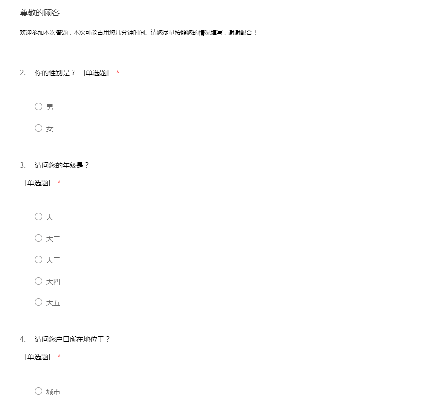 欢迎参加本次答题,本次可能占用您几分钟时间。请您尽量按照您的情况填写,谢谢配合!
