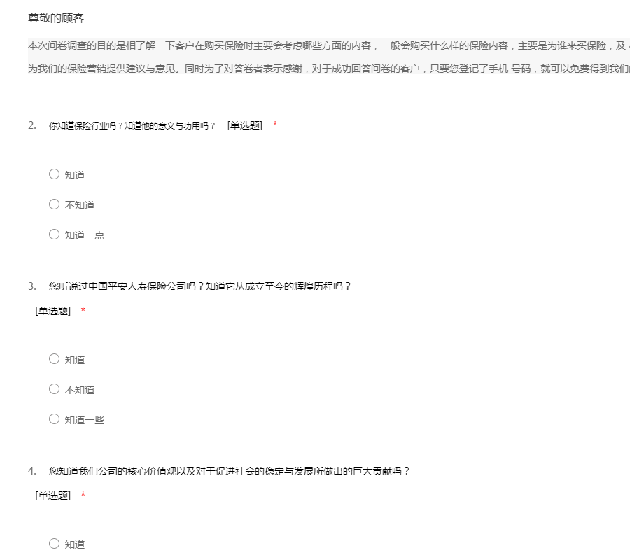 本次问卷调查的目的是相了解一下客户在购买保险时主要会考虑哪些方面的内容,一般会购买什么样的保险内容,主要是为谁来买保险,及 在选择保险公司时会考虑的一些因素等。为我们的保险营销提供建议与意见。同时为了对答卷者表示感谢,对于成功回答问卷的客户,只要您登记了手机 号码,就可以免费得到我们的2个月免费意外险的保单。