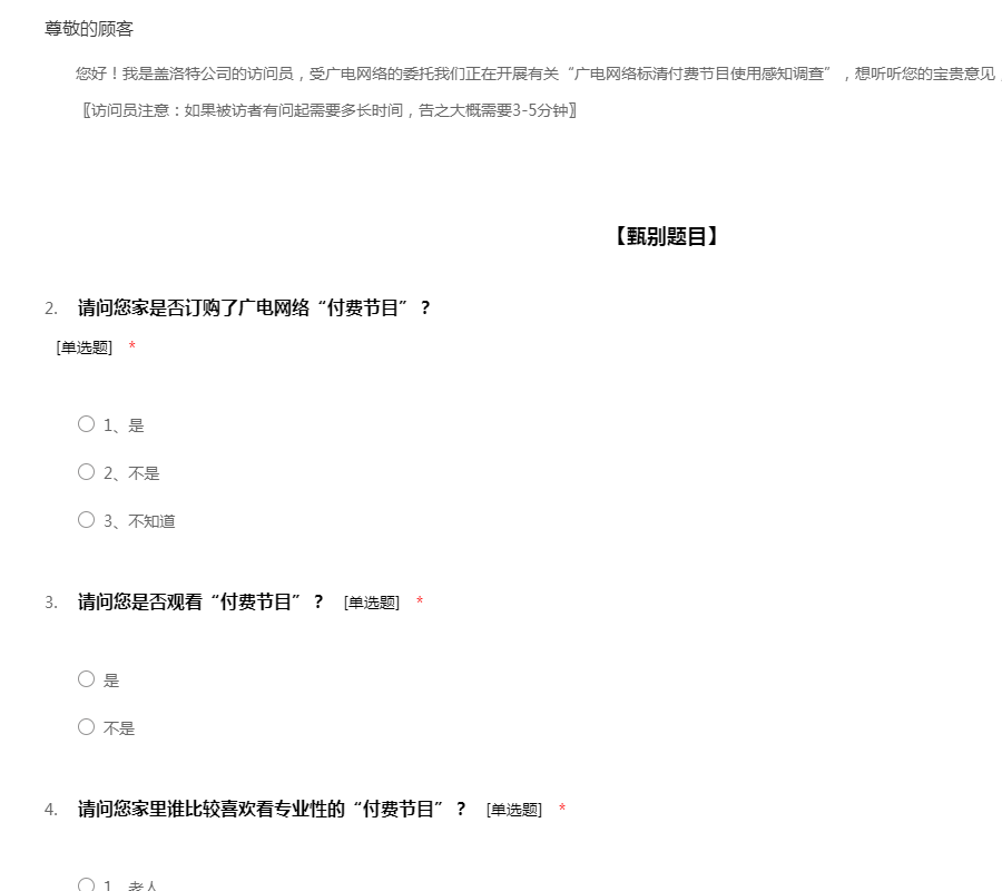 您好!我是盖洛特公司的访问员,受广电网络的委托我们正在开展有关“广电网络标清付费节目使用感知调查”,想听听您的宝贵意见,耽误您一些时间,可以吗?谢谢! 〖访问员注意:如果被访者有问起需要多长时间,告之大概需要3-5分钟〗