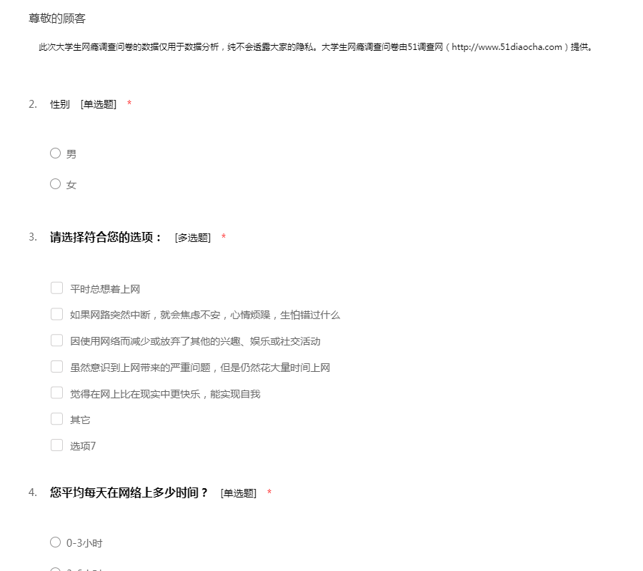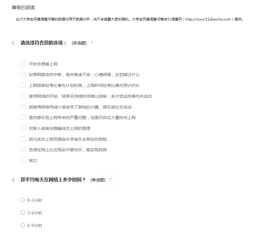 此次大学生网瘾调查问卷的数据仅用于数据分析,纯不会透露大家的隐私。大学生网瘾调查问卷由51调查网(http://www.51diaocha.com)提供。