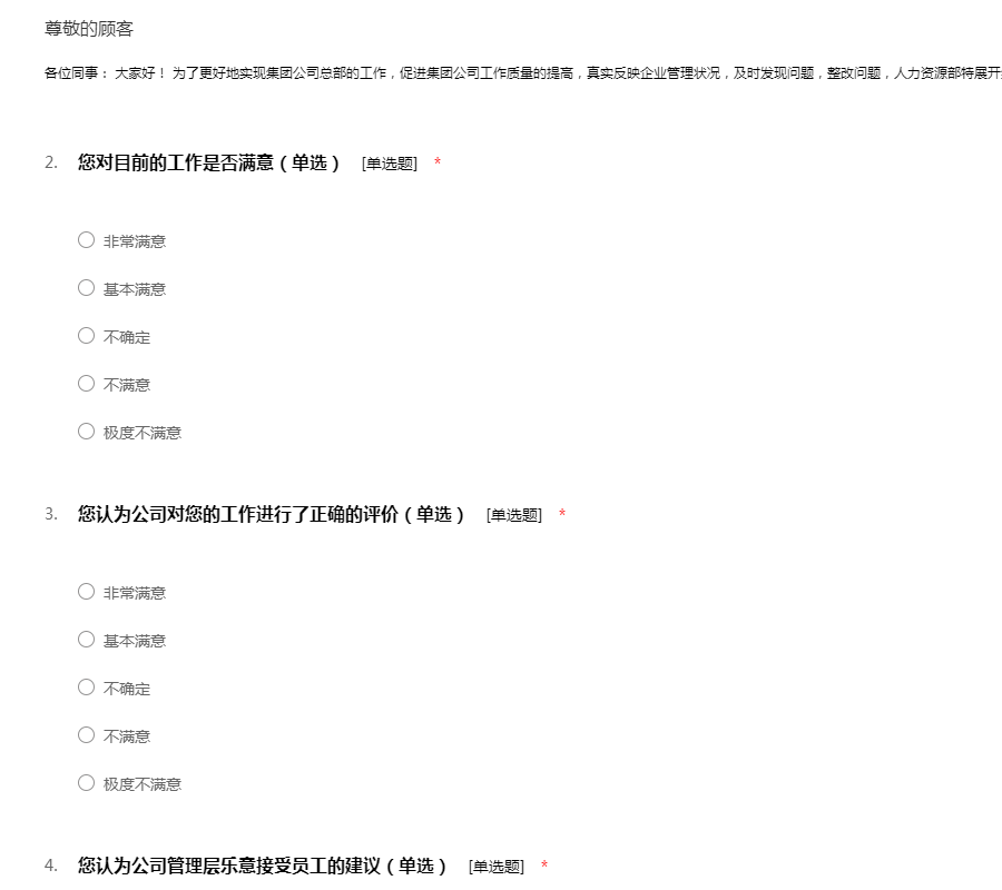 各位同事: 大家好! 为了更好地实现集团公司总部的工作,促进集团公司工作质量的提高,真实反映企业管理状况,及时发现问题,整改问题,人力资源部特展开集团员工满意度测评。