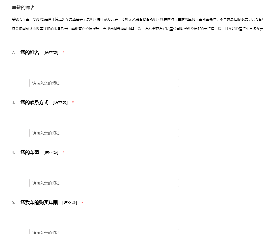 尊敬的车主:您好!您是否计算过买车贵还是养车贵呢?用什么方式养车才科学又更省心省钱呢?好胎屋汽车生活网重视车主利益保障,本着负责任的态度,以问卷形式开展一次养车相关问题调查。希望通过了解您关切问题从而改善我们的服务质量,实现客户价值提升。完成此问卷均可抽奖一次,有机会获得好胎屋公司拟提供价值100元打蜡一份!以及好胎屋汽车更多保养优惠喔!