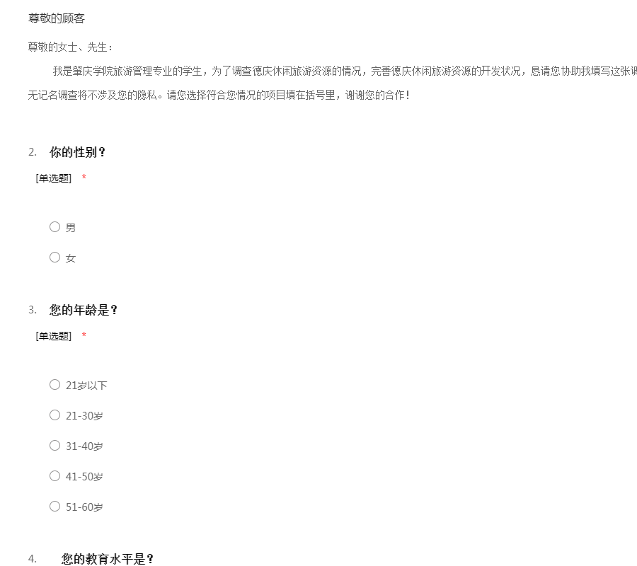 尊敬的女士、先生: 我是肇庆学院旅游管理专业的学生,为了调查德庆休闲旅游资源的情况,完善德庆休闲旅游资源的开发状况,恳请您协助我填写这张调查问卷,本问卷只为学位论文研究所用,无记名调查将不涉及您的隐私。请您选择符合您情况的项目填在括号里,谢谢您的合作!