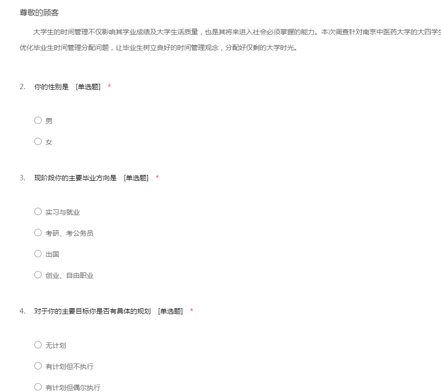 大学生的时间管理不仅影响其学业成绩及大学生活质量,也是其将来进入社会必须掌握的能力。本次调查针对南京中医药大学的大四学生,了解大四学生的时间管理情况。旨在优化毕业生时间管理分配问题,让毕业生树立良好的时间管理观念,分配好仅剩的大学时光。