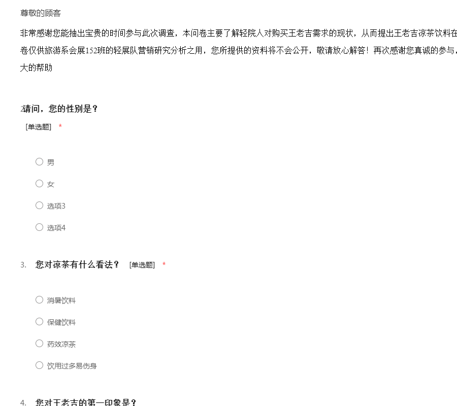 非常感谢您能抽出宝贵的时间参与此次调查,本问卷主要了解轻院人对购买王老吉需求的现状,从而提出王老吉凉茶饮料在轻院相应的销售措施及建议。本问卷仅供旅游系会展152班的轻展队营销研究分析之用,您所提供的资料将不会公开,敬请放心解答!再次感谢您真诚的参与,您的协助将会为我们的调研带来更大的帮助