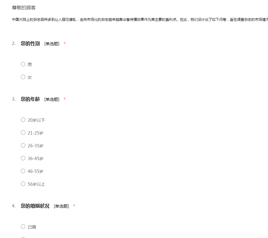 中国大陆上的杂志品种多到让人眼花缭乱,走向市场化的杂志越来越靠出售传播效果作为其主要的盈利点。在此,我们设计出了如下问卷,旨在调查杂志的市场情况,希望您能如实填写。谢谢!
