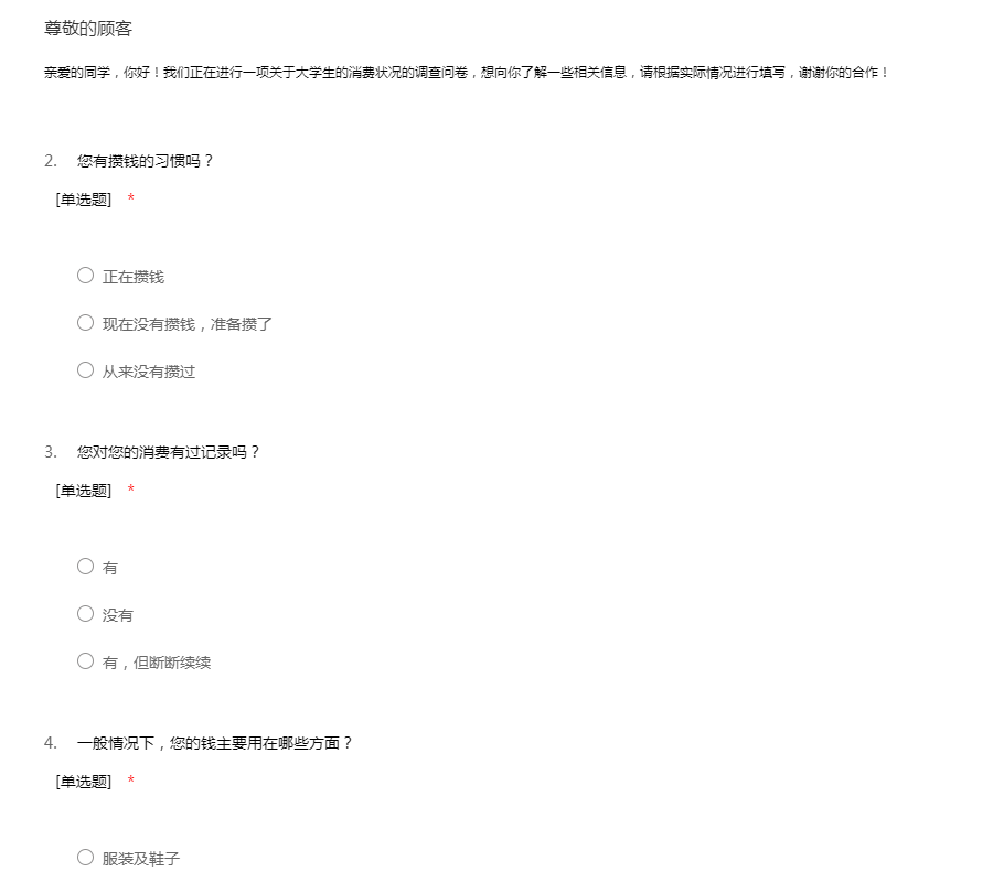 亲爱的同学,你好!我们正在进行一项关于大学生的消费状况的调查问卷,想向你了解一些相关信息,请根据实际情况进行填写,谢谢你的合作!