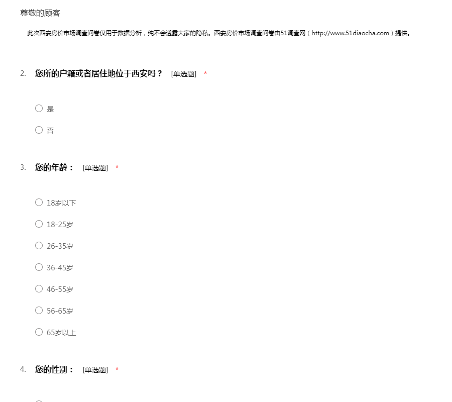 此次西安房价市场调查问卷仅用于数据分析,纯不会透露大家的隐私。西安房价市场调查问卷由51调查网(http://www.51diaocha.com)提供。