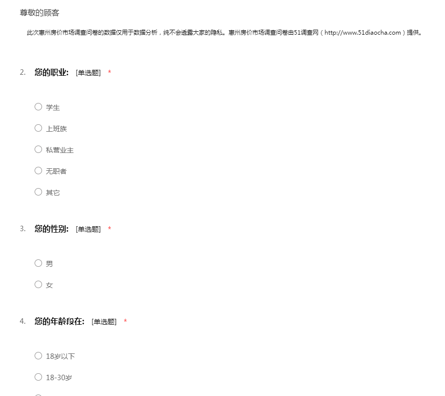 此次惠州房价市场调查问卷的数据仅用于数据分析,纯不会透露大家的隐私。惠州房价市场调查问卷由51调查网(http://www.51diaocha.com)提供。