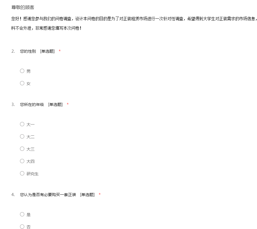 您好!感谢您参与我们的问卷调查,设计本问卷的目的是为了对正装租赁市场进行一次针对性调查,希望得到大学生对正装需求的市场信息,此次调查数据仅作为数据参考,您的资料不会外泄,非常感谢您填写本次问卷!