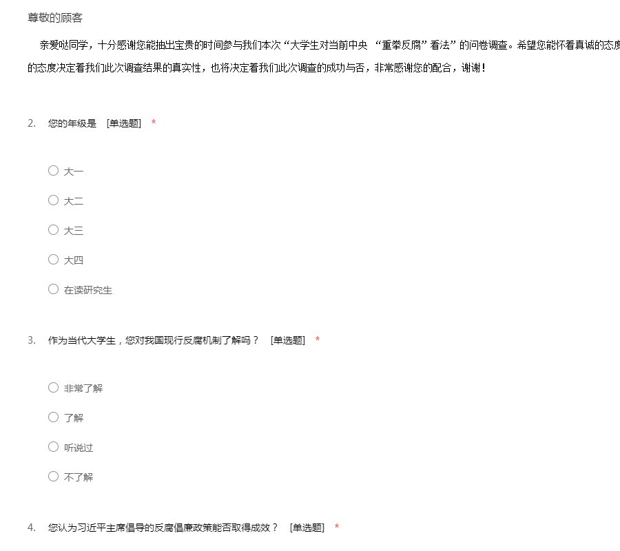 亲爱哒同学,十分感谢您能抽出宝贵的时间参与我们本次“大学生对当前中央 “重拳反腐”看法”的问卷调查。希望您能怀着真诚的态度,认真仔细的完成我们的问题,。因为您的态度决定着我们此次调查结果的真实性,也将决定着我们此次调查的成功与否,非常感谢您的配合,谢谢!