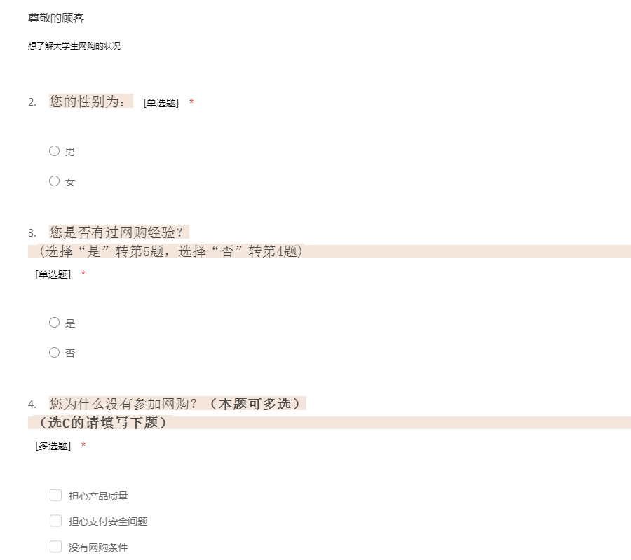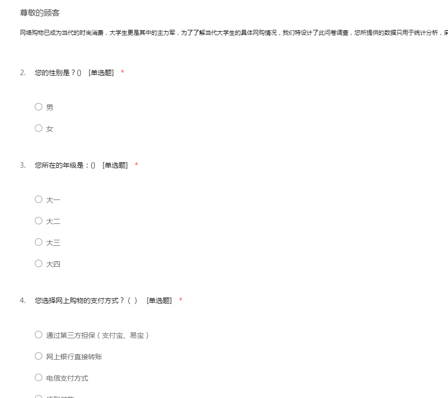网络购物已成为当代的时尚消费,大学生更是其中的主力军,为了了解当代大学生的具体网购情况,我们特设计了此问卷调查,您所提供的数据只用于统计分析,麻烦您能在百忙之中给与帮助与支持,谢谢!