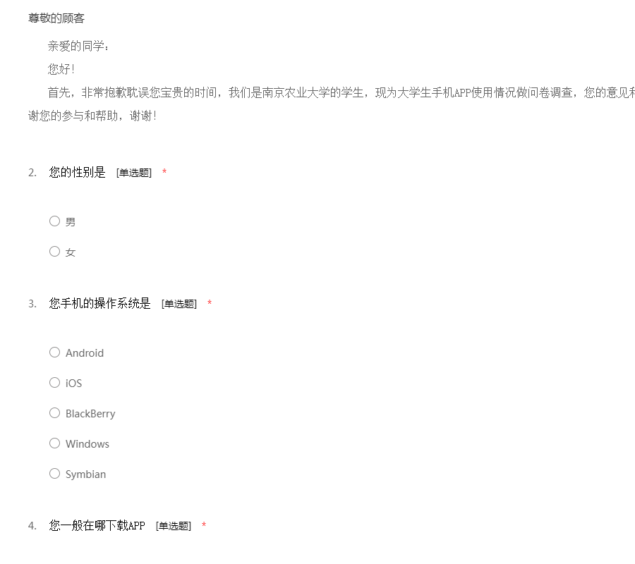 亲爱的同学: 您好! 首先,非常抱歉耽误您宝贵的时间,我们是南京农业大学的学生,现为大学生手机APP使用情况做问卷调查,您的意见和建议对此次调查非常重要,非常感谢您的参与和帮助,谢谢!