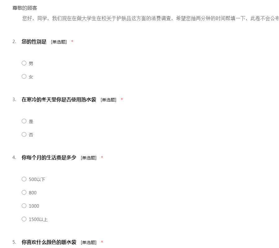 您好,同学,我们现在在做大学生在校关于护肤品这方面的消费调查,希望您抽两分钟的时间帮填一下,此卷不会公布,可放心填写,谢谢合作!