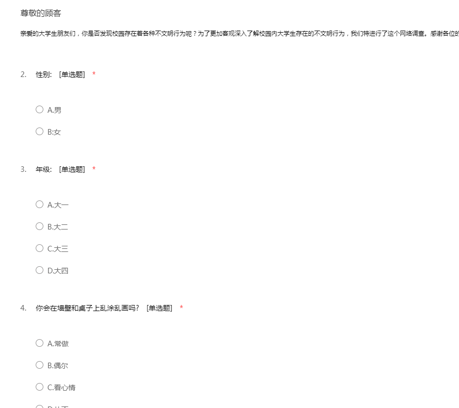 亲爱的大学生朋友们,你是否发现校园存在着各种不文明行为呢?为了更加客观深入了解校园内大学生存在的不文明行为,我们特进行了这个网络调查。感谢各位的合作与支持!