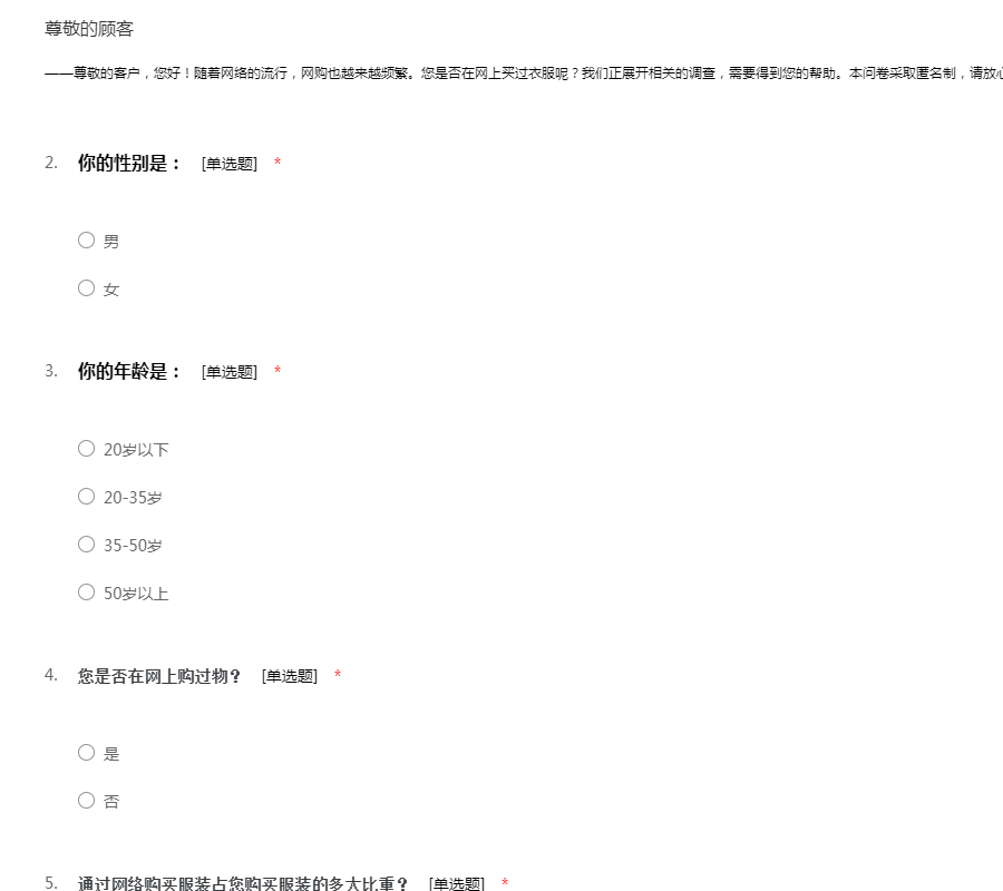 ——尊敬的客户,您好!随着网络的流行,网购也越来越频繁。您是否在网上买过衣服呢?我们正展开相关的调查,需要得到您的帮助。本问卷采取匿名制,请放心填写。