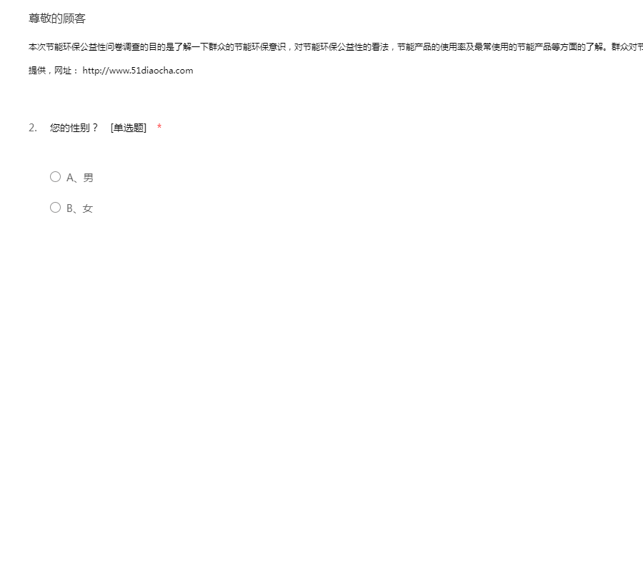 本次节能环保公益性问卷调查的目的是了解一下群众的节能环保意识,对节能环保公益性的看法,节能产品的使用率及最常使用的节能产品等方面的了解。群众对节能环保公益性的看法问卷调查模板是我要调查网提供,网址: http://www.51diaocha.com