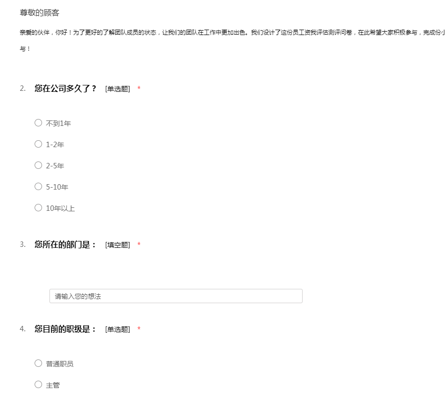 亲爱的伙伴,你好!为了更好的了解团队成员的状态,让我们的团队在工作中更加出色。我们设计了这份员工资我评估测评问卷,在此希望大家积极参与,完成份小问卷。请根据的实际情况进行填答,感谢你的参与!