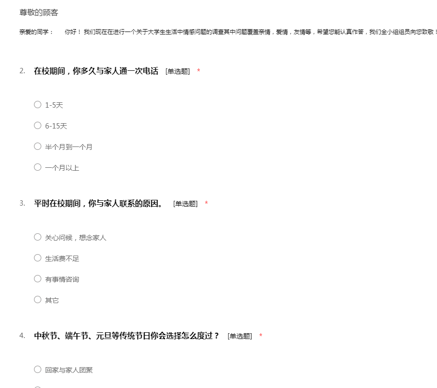 亲爱的同学: 你好! 我们现在在进行一个关于大学生生活中情感问题的调查其中问题覆盖亲情,爱情,友情等,希望您能认真作答,我们全小组组员向您致敬!