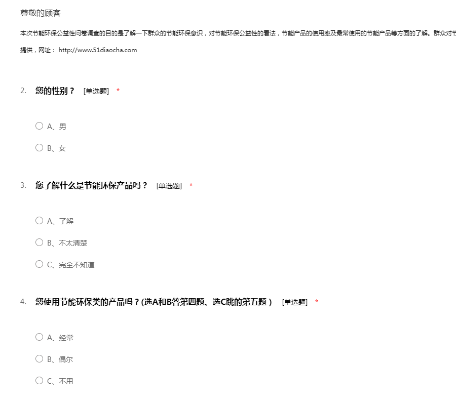 本次节能环保公益性问卷调查的目的是了解一下群众的节能环保意识,对节能环保公益性的看法,节能产品的使用率及最常使用的节能产品等方面的了解。群众对节能环保公益性的看法问卷调查模板是我要调查网提供,网址: http://www.51diaocha.com
